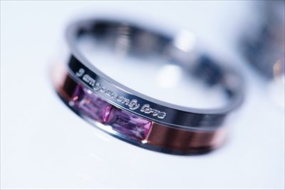 メッセージ彫り&ブラック or ピンクゴールドラインデザイン バゲットカット 2キュービックジルコニア装飾 ステンレスペアリング【You are my only love】