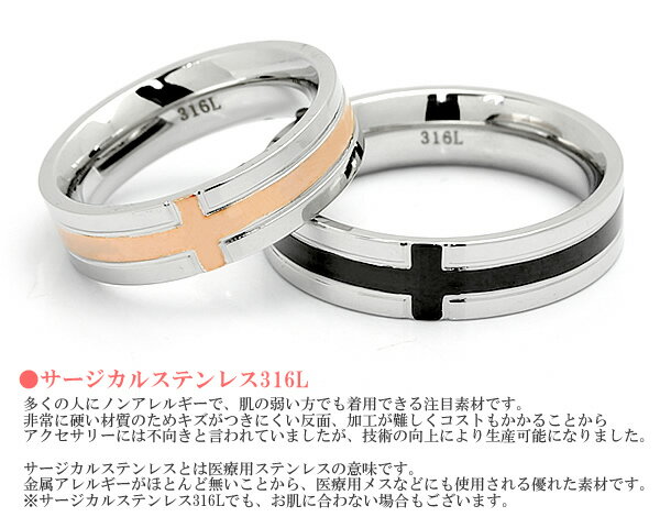 【ペアリング】 サージカルステンレス316L 指輪 クロス ブラック ピンクゴールド アレルギーフリー メンズ レディース 女性用 男性用 十字架 Men's Lady's 父の日 ギフト