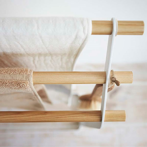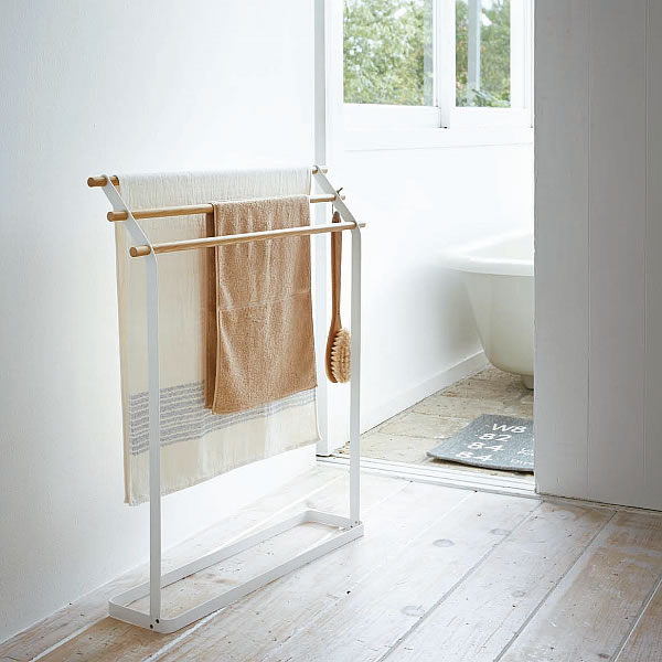 温かみのある木製バーと白いスチールでデザインされた『tosca バスタオルハンガー』は清潔感のあるランドリーの雰囲気にもぴったりと合います。